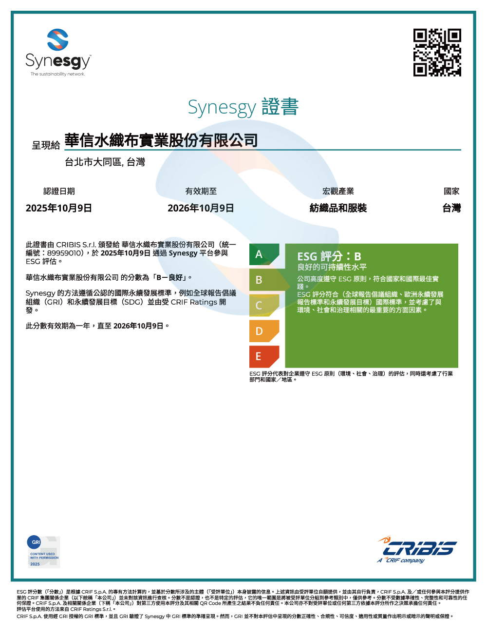 華信水織布實業股份有限公司於 2025年10月9日 通過 Synesgy ESG 評級審查,榮獲 「B」級良好評價,象徵公司在 環境(Environment)、社會(Social) 與 治理(Governance) 三大面向均展現良好永續表現。此評級由 CRIF Ratings S.r.l. 依據國際標準(GRI、SDG)進行評核,效期至 2026年10月9日。